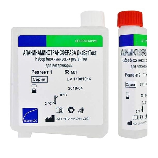 Набор биохимических реагентов для ветеринарии Аланинаминотрансфераза ДиаВетТест предназначен для определения активности аланинаминотрансферазы в крови животных.