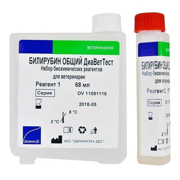 Набор биохимических реагентов для ветеринарии Билирубин общий ДиаВетТест предназначен для определения активности общего билирубина в крови животных.